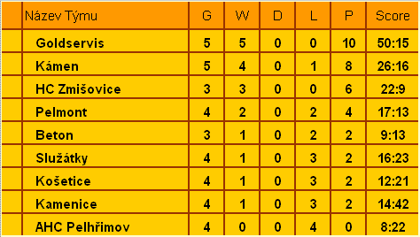 | Kámen | 1:7 | XXX | 4:0 | 4:3 | 5:2 | 12:4 | |||